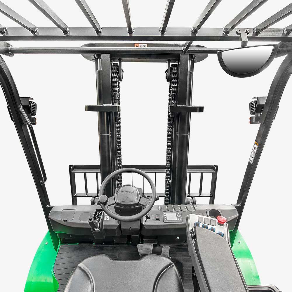 Geniş görüşlü direk, geniş görüşlü tavan koruması ve alçak ön panelin optimize edilmiş tasarımı, operatöre daha geniş bir görüş açısı ve daha yüksek güvenlik sağlar.